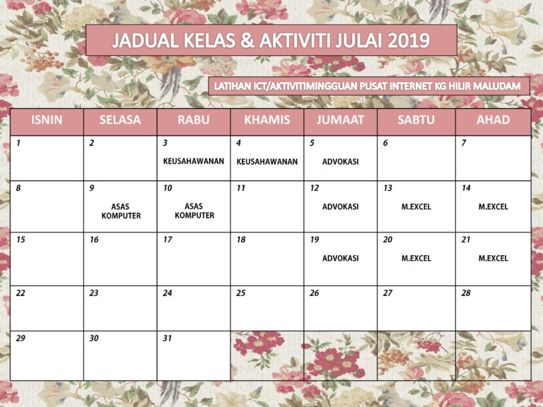 Tarikh : 7, 8, 9, dan 10 Mei 2019 Masa : 9.00 pagi sehingga 11.00 pagi Lokasi : Pusat Internet Hilir Maludam Peserta : Belia dan wanita Tujuan : Membimbing peserta dengan modul keusahawanan dan memberi pendedahan atas talian […]