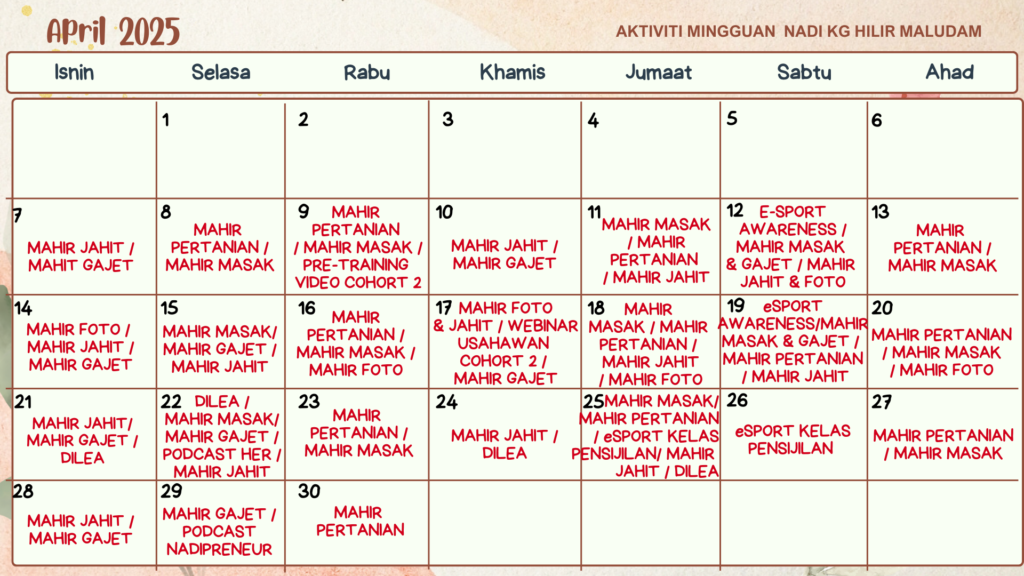 JADUAL KELAS & AKTIVITI APRIL 2025