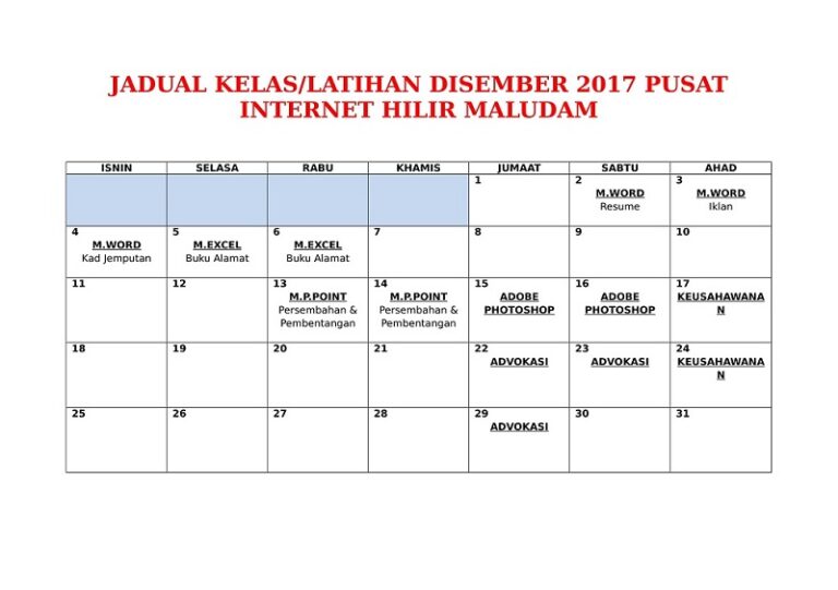 JADUAL KELAS & AKTIVITI DISEMBER 2017