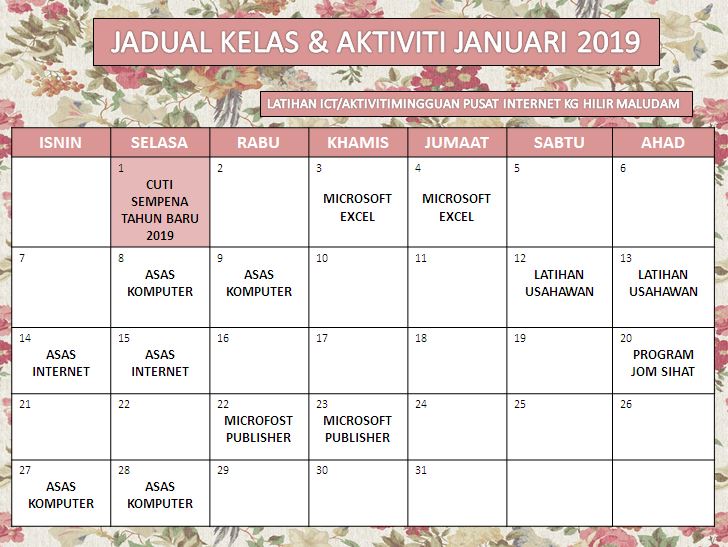 JADUAL KELAS / LATIHAN JANUARI 2019